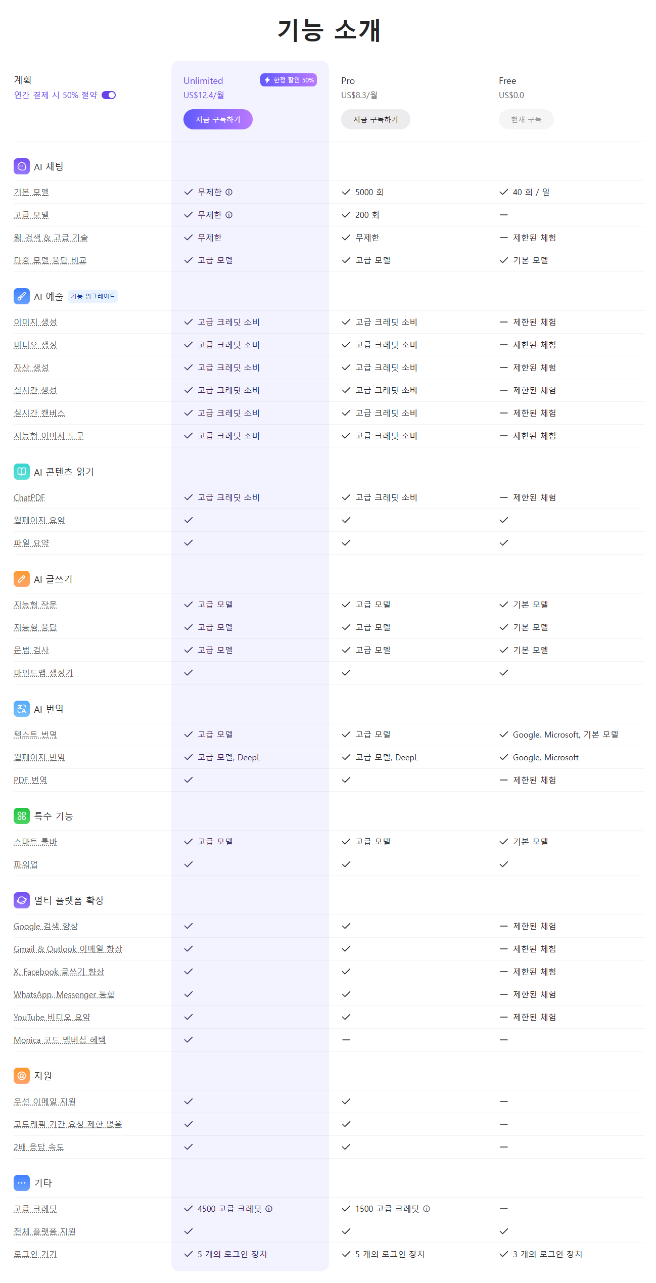 | 채팅AI | Monica, DeepSeek V3, DeepSeek R1, GPT-4o, GPT-4.5, Claude 3.7 Sonnet, Claude 3.7 Sonnet Thinking, Claude 3.5 Sonnet V2, o1, o3-mini, DeepClaude, Perplexity-reasoning, Perplexity, Claude 3.5 Haiku, GPT-4o mini, Gemini 2.0 Pro, Gemini 2.0 Flash, Gemini 2.0 Flash Thinking, Llama 3.1 405B, Llama 3.1 70B Ultra-Fast, GPT-4, DALL.E 3 |