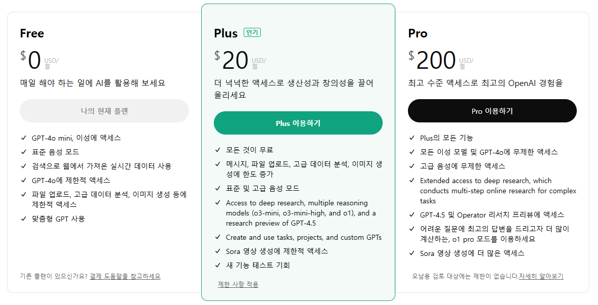 'Plus버전'은 월 '20$'이고, 'Pro버전'은 월 '200$'입니다.